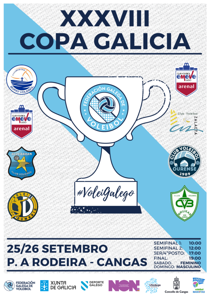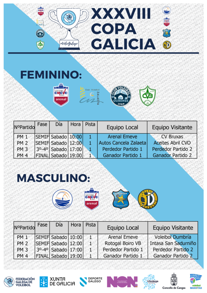 No apartado masculino o Rotogal Boiro (Superliga), Arenal Emevé (Superliga) , Aldebarán San Sadurniño (Superliga) e Dumbría Voleibol (Superliga 2) pecharán con outro gran espectáculo deportivo o evento, cas semifinais programadas para a mañán do domingo e os partidos decisivos da tarde. Os lucenses defenderán un título que estará máis caro que nunca, o que asegura emoción na pista.