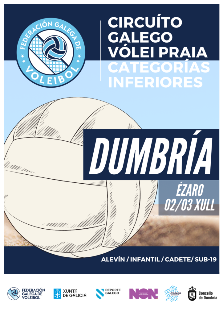 Os pequenos e pequenas do noso voleibol teñen unha cita os días 2 e 3 de xullo en Dumbría. Despois do aprazamento da proba de Boiro, a praia do Ézaro acollerá a primeira das probas para este verán de 2022 nas categorías alevín, infantil, cadete e Sub-19. A Federación Galega de Voelibol quere destacar o compromiso un ano máis do Concello de Dumbría e da Deputación de A Coruña para acoller unha proba do Circuito Galego, agradecéndolle a súa colaboración na organización do evento.