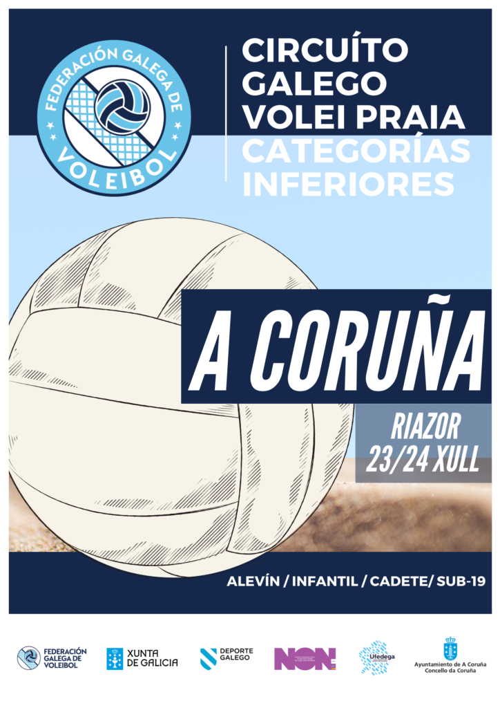 A Coruña repite por segundo ano consecutivo no Circuíto Galego de Vólei Praia de Categorías Inferiores, congregando aos nosos pequenos deportistas para desputar a próxima fin de semana do 23 de xullo unha nova xornada de dous días de competición nas categorías infantil e Sub-19 (sábado) e alevín e cadete (domingo).