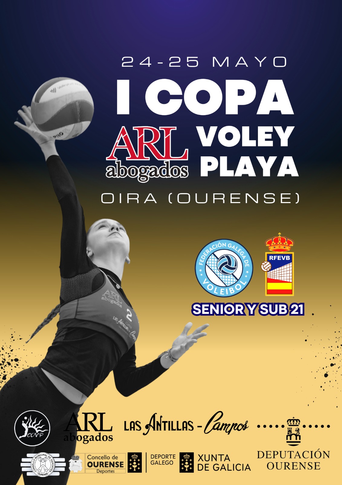 O vólei praia sénior/Sub21 volve a ao Recinto Deportivo de Oira Praia ca celebración da I Copa ARL Abogados. Esta proba, celebrada os días 24 e 25 de maio grazas ao Club Ourense Vólei Praia, será puntuable para Ranking Galego e Campionatos de España.