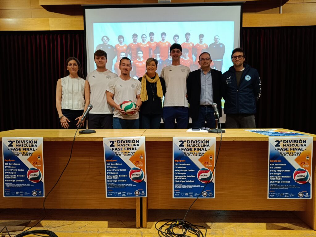 O Concello de Oleiros e o Club Voleibol Oleiros presentaron esta mañá, no Auditorio da Fábrica, a Fase Final de Ascenso á 1ª División Masculina, que se celebrará no municipio desde este venres 23 ao domingo 25.No acto estiveron presentes a Concelleira de Deportes, Teresa Vázquez Maseda; a tesoureira do CV Oleiros, Mar Bustabad; Alberto García, Director de Comunicación e Marketing da Federación Galega de Voleibol; o adestrador do equipo sénior masculino, Luis Cuadrado; o capitán, Rubén Martínez, e varios xogadores do equipo.