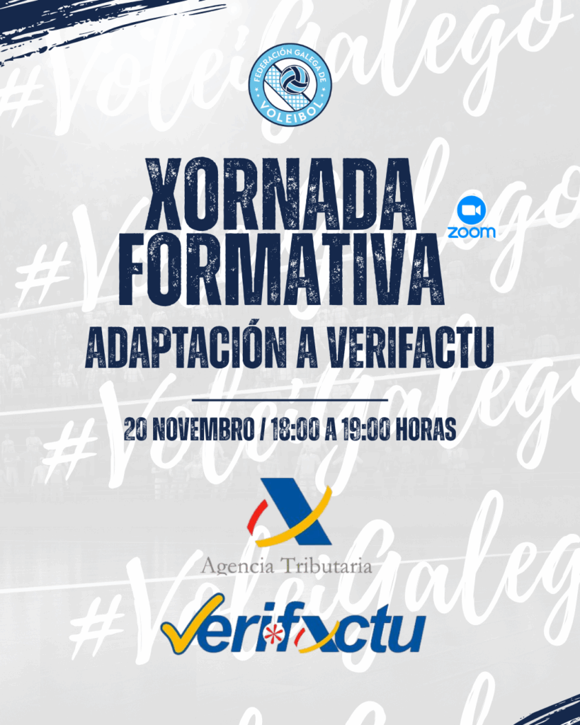 A Federación Galega de Voleibol celebrará o vindeiro jueves 20 de novembro, de 18:00 a 19:00 horas, unha reunión dirixida aos clubs galegos co obxectivo de explicar o proceso de adaptación ao sistema Verifactu, a nova ferramenta promovida pola Axencia Tributaria para o control e validación das facturas emitidas.