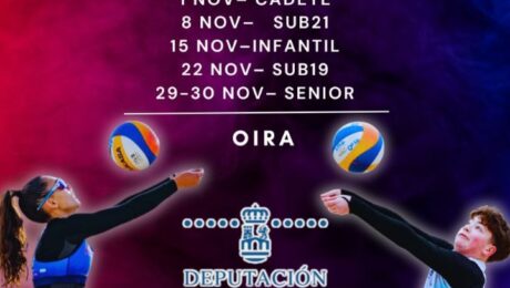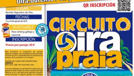 O vindeiro 23 e 24 de agosto celebrarase a terceira proba de verán do circuíto Oira Praia 2025, organizada polo Club Volei Praia Milenio Ourense e puntuable para o ranking galego e nacional. As categorías serán sénior/sub21 feminino e sénior/sub21 masculino. Será imprescindible ter a licenza e o seguro deportivo en vigor (data límite de